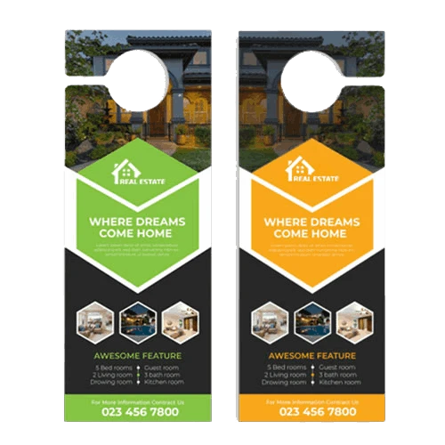 Door hangers are printed pieces of cardstock that are typically hung on door handles or knobs. Door hangers can be a very effective medium to share marketing or other information. These hangers can be used to deliver business information, marketing and promotional offers, or other types of information right to your customer’s door front.
